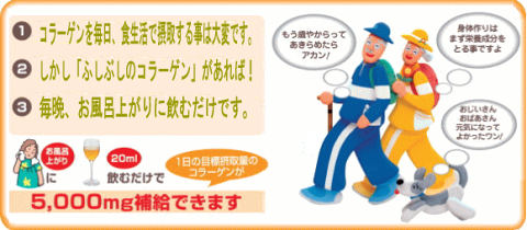 お酒の割り材にもよし、そのまま水で薄めて飲んでよしのふしぶしのコラーゲンです。