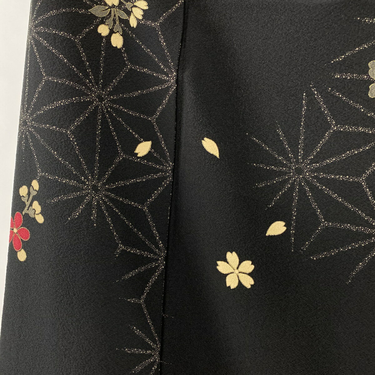【お得なクーポン配布中 11/24 1:59迄】 小紋 秀品 麻の葉 草花 金彩 縮緬 黒 袷 身丈160cm 裄丈65cm M 正絹 【中古】