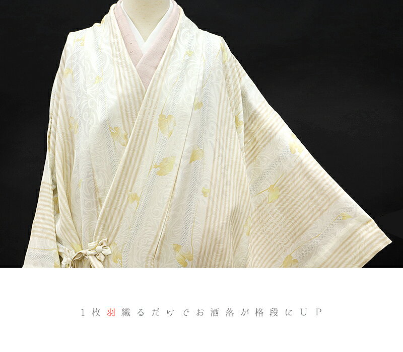 道中着 羽織 紋紗 正絹 スリーシーズン 黄土色 オフホワイト 蔦 縞 ストライプ 水玉 ドット 唐草 ぼかし 高級ちりめん お仕立て上がり お洒落着 塵除け おしゃれ かわいい 透ける 春 夏 秋 No.3-0247