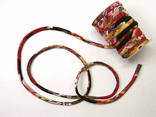 ちりめん丸ひも・柄・7ミリ(実寸約7-8ミリ) 菊水・黒赤紫■表地(ちりめん):ポリエステル100% 古典的な柄ゆきが落ち着いた色で表現されています。