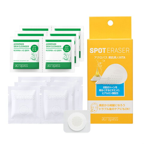 商品詳細 製品名 acropass (アクロパス) スポットイレイザー 素肌美人 VITA (SPOT ERASER ヴィータ スキンケアシート パッチ ニードルパッチ 美容液 FACE) 内容量 アクロパス スキンクレンザー 6枚 アクロパス 素肌美人VITA 成分 加水分解ヒアルロン酸、ナイアシンアミド、アスコルビン酸、アルブチン、マカデミアナッツ油、油溶性甘草エキス 商品説明 1箱6パッチ+クレンザー6個入り ビタミンCやヒアルロ酸を配合した、スポットケア用の貼るスキンケアパッチです。