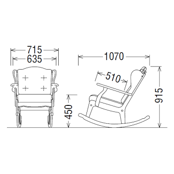 ■サイズ幅:715mm 奥行:1070mm 高さ:915mm 座高:450mm ■張り地布・モダン:U52グループ■木部塗装色コロニアルウォールナット色■主要木材ブナ単材■クッション材連結式鋼製組バネ・ウレタンフォーム・わた【カリモクのこだわり】■休日の昼下がりに、揺れながらの居眠り…映画のワンシーンのような、ゆとりと、くつろぎが似合うロッキングチェアー。