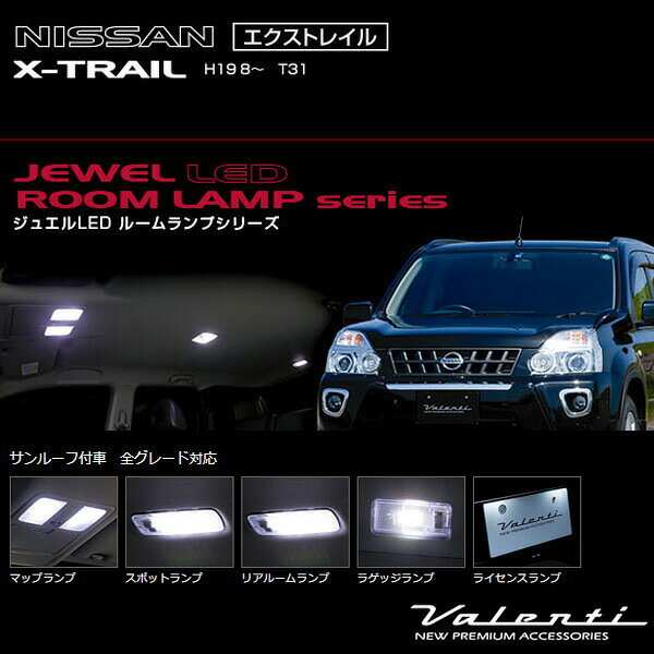 純正ランプと交換するだけの簡単取り付け■適合【車種】 ニッサン エクストレイル【年式】 H19.8〜【型式】 T31【備考】 全グレード対応・サンルーフ付車■セット内容マップランプ(21LED)×2スポットランプ(18LED)×2リアルームランプ(18LED)×1ラゲッジランプ(15LED)×1ライセンスランプ(2LED)×2ヴァレンティ/Valenti品番:RL-PCS-XT1-1
