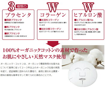 プロテオグリカンが浸透した肌の水分保持率を測ると、ヒアルロン酸の1.3倍! 3種類のプラセンタ配合 発酵プラセンタ+馬プラセンタ+豚プラセンタ コラーゲン配合 水溶性コラーゲン+加水分解コラーゲン ヒアルロン酸配合 ヒアルロン酸Na+加水分解ヒアルロン酸 100%オーガニックコットン使用 オーガニック・コットンは、オーガニック農産物等の生産方法について基準に従って2〜3年以上のオーガニック生産の実践を経て、認証機関に認められた農地で、栽培に使われる農薬・肥料の厳格な基準を守って育てられた綿花のことです。