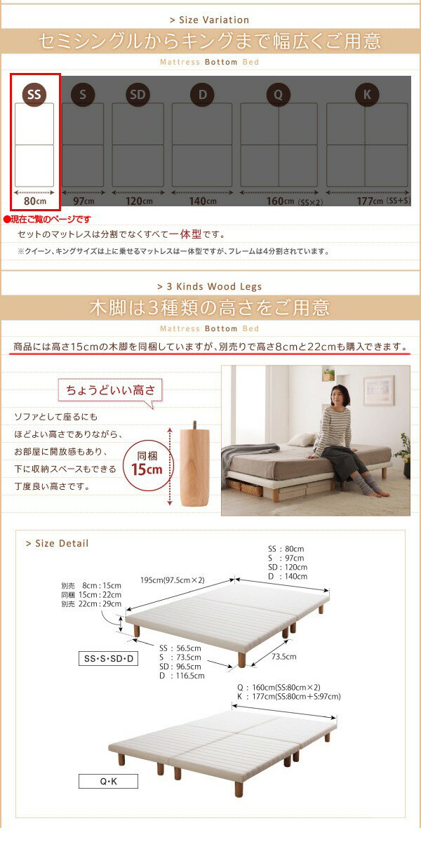 商品名セミシングルベッド 一人暮らし コンパクト SS 小さい ミニ 省スペース 脚付き マットレスベッド ボトムベッド 足付 ベンチ ソファー ヘッドレス ヘッドボードなし すのこ 通気性 除湿 カビ ローベッド ロータイプ フロア 低床 低い ルンバ 土台 北欧 おしゃれ モダン アンティーク商品バリエーション標準ボンネルコイルマットレス付き セミシングル 脚15cm全バリエーション商品説明 搬入・組立・簡単!選べる7つの寝心地!すのこ構造 脚付きマットレス ボトムベッド【製品サイズ/重量】同梱 脚15cm 使用時セミシングル:幅80x長さ195x高さ22cm/13kgシングル:幅97x長さ195x高さ22cm/16kgセミダブル:幅120x長さ195x高さ22cm/18kgダブル:幅140x長さ195x高さ22cm/20kgクイーン(セミシングル2台):幅160x長さ195x高さ22cm/26kgキング(セミシングル1台とシングル1台):幅180x長さ195x高さ22cm/29kg床面から床下:14cm別売り 脚8cm 使用時セミシングル:幅80x長さ195x高さ15cm/12kgシングル:幅97x長さ195x高さ15cm/15Kgセミダブル:幅120x長さ195x高さ15cm/17kgダブル:幅140x長さ195x高さ15cm/19kgクイーン(セミシングル2台):幅160x長さ195x高さ15cm/24kgキング(セミシングル1台とシングル1台):幅180x長さ195x高さ15cm/27kg床面から床下:7cm別売り 脚22cm 使用時セミシングル:幅80x長さ195x高さ29cm/14kgシングル:幅97x長さ195x高さ29cm/17kgセミダブル:幅120x長さ195x高さ29cm/19kgダブル:幅140x長さ195x高さ29cm/21kgクイーン(セミシングル2台):幅160x長さ195x高さ29cm/28kgキング(セミシングル1台とシングル1台):幅180x長さ195x高さ29cm/31kg床面から床下:21cm脚の太さ:直径6cm【ベッド材質】木脚、天然木、ウレタンフォーム、フェルト、不織布、ポリエステル100%生地【生産国】中国【梱包サイズ・梱包重量】同梱 脚15cmセミシングル:幅81x長さ105x高さ13cm/14kgシングル:幅98x長さ105x高さ13cm/17kgセミダブル:幅121x長さ105x高さ13cm/19kgダブル:幅141x長さ105x高さ13cm/21kgクイーン:セミシングル2台分キング:セミシングル1台とシングル1台分別売り脚8cm(8本入り):幅38cmx長さ14cmx高さ8cm/2kg別売り脚22cm(8本入り):幅93cmx長さ14cmx高さ8cm/4kg※お客様組み立て品※ベッドのフレームはスプリングマットレス使用時の基準で強度計算されております。