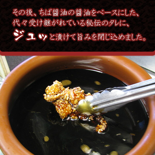 素揚げしたにんにくもご一緒に!!袋を開けた瞬間に広がるにんにくの香りと、風味豊かな醤油の香りが、アナタの食欲を刺激します!!揚げたあと、秘伝のタレにジュッと漬けてあるので《しっとり》 《柔らかい》 唐揚げです!!