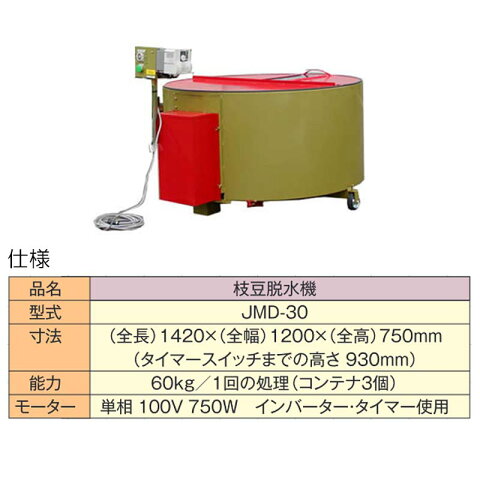◆仕様 型式:JMD-30 寸法:(全長)1,420×(全幅)1200×(全高)750mm (タイマースイッチまでの高さ 930mm) 能力:60kg/1回処理量(コンテナ3個) モーター:単相100V 750W インバーター・タイマー付ホクエツのえだまめ関連機器