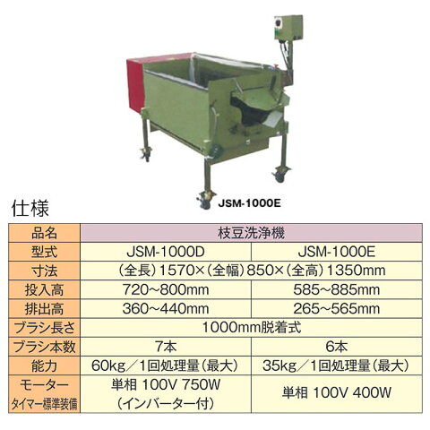 ◆仕様 型式:JSM-1000E 寸法:(全長)1,570×(全幅)850×(全高)1,350mm 投入高:585〜885mm 排出高:265〜565mm ブラシ長さ:1000mm 脱着式 ブラシ本数:6本 能力:35kg/1回処理量(最大) モーター タイマー標準装備:単相100V 400Wホクエツのえだまめ関連機器