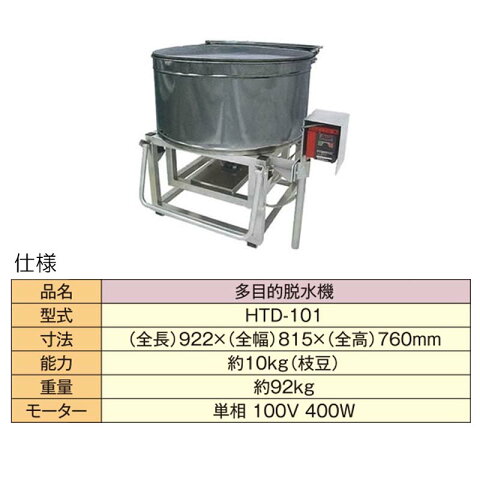 ◆仕様 型式:HTD-101F 寸法:(全長)922×(全幅)815×(全高)760mm 能力:10kg (枝豆) 重量:約92kg モーター:単相100V 400W インバーター付 材質:ステンレス (脱水槽)ホクエツの多目的脱水機