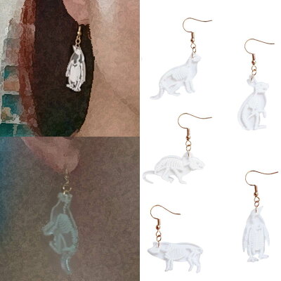 ペンギンとウサギとネコとブタとネズミの標本のような透明のプラスチックに白色の骨をデザインした動物モチーフのアニマルステンレスピアス。